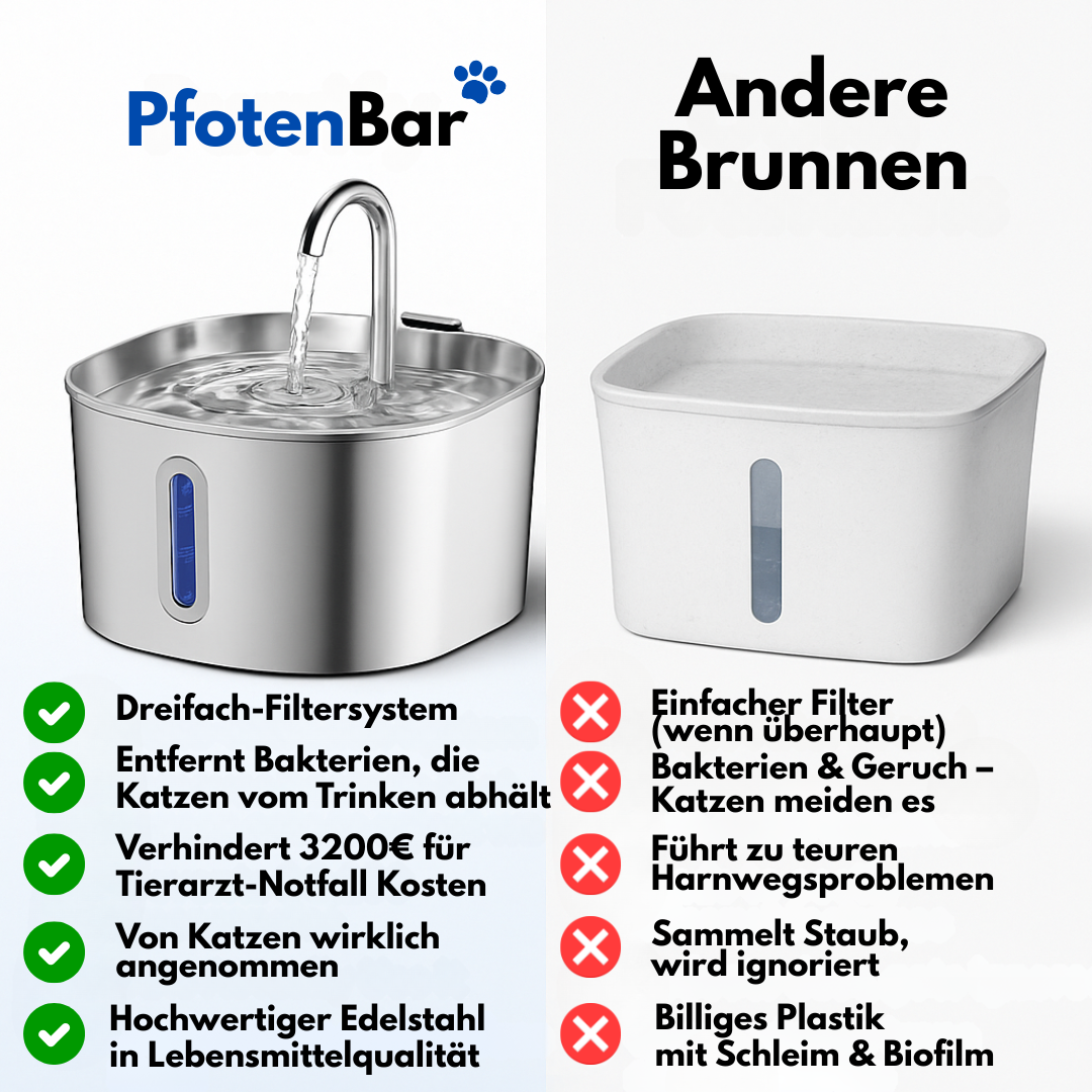 Warte nicht, bis ein lebensbedrohlicher Notfall eintritt. Das 3-fach-Filtersystem der PfotenBar hilft, Dehydrierung, Nierenerkrankungen und Harnwegsblockaden vorzubeugen – bevor sie entstehen.
